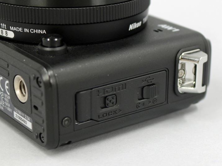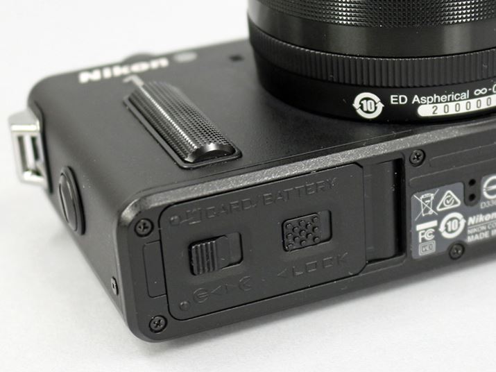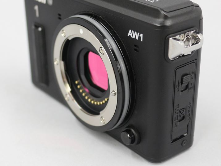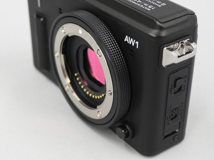 「Nikon 1 AW1」の独特な機構が、レンズマウントの側面にある「0リング」(グレーのゴムのような部分)。「0リング」を装着することでレンズとカメラの接続部が密封され、防水性が保たれるのだという。本体サイズは、113.3(幅)×71.5(高さ)×37.5(奥行)mm。水中でのレンズ交換はできない