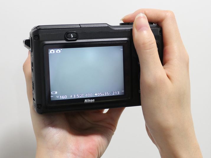 筆者は「Nikon 1 AW1 防水ズームレンズキット」を購入したので、標準ズームレンズ「1 NIKKOR AW 11-27.5mm f/3.5-5.6」をボディに装着。カメラ本体のみの重量は約313gだが、「1 NIKKOR AW 11-27.5mm f/3.5-5.6」やバッテリー、SDメモリーカードを含めた重量は約525gとなる