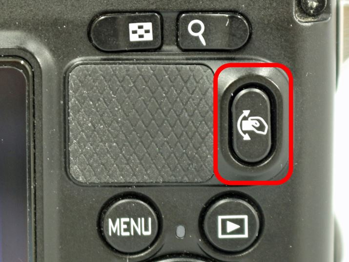 背面には、3.0型の液晶モニターとズームやメニューなどを切り替えるためのボタンがある。そして、親指を添えるグリップ部分には、アウトドアでの操作をよりスムーズに行うための「アクションボタン」を装備(赤い囲み部分)。「アクションボタン」の使い方については、後でくわしく説明する