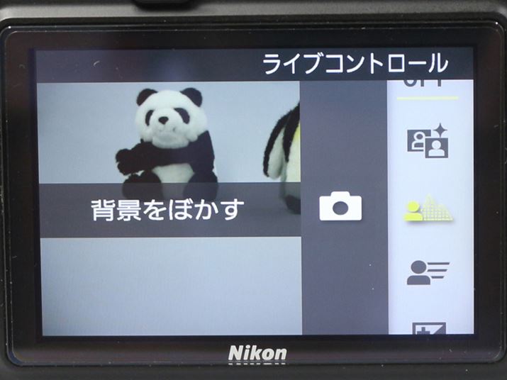 「ライブコントロール」には、「明暗差を強調する」「背景をぼかす」「動きを表現する」「明るさを変える」という4つの効果を用意。コントラストやぼけ具合、シャッタースピード、ホワイトバランスを液晶モニターで確認しながら調整できる