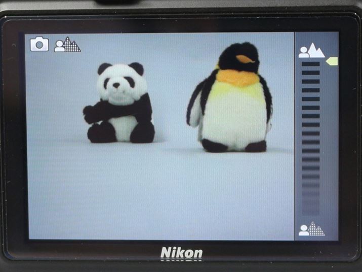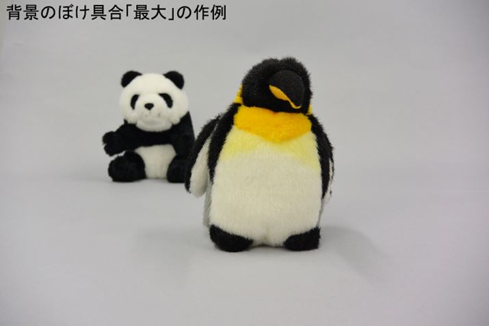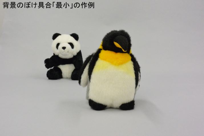 ペンギンを中心にして背景のぼけ具合を変えて撮ってみた。ぼけ具合を「最大」にすると、うしろにいるパンダの輪郭がぼやけた