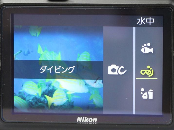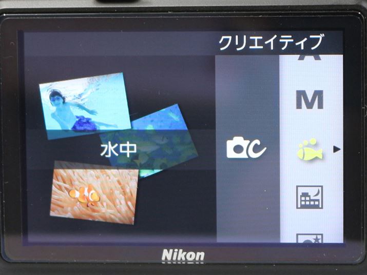 「クリエイティブモード」の「水中」を選ぶと、浅い水深に適する「スタンダード」や深い水深に最適な「ダイビング」、被写体に近接して撮る時に役立つ「クローズアップ」といったモードが選択可能