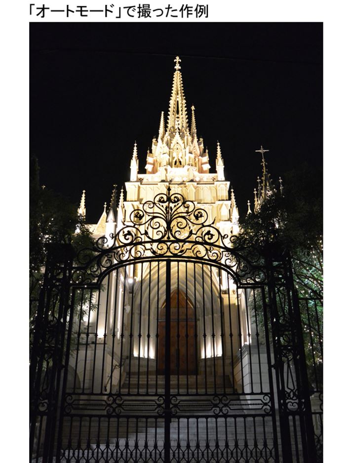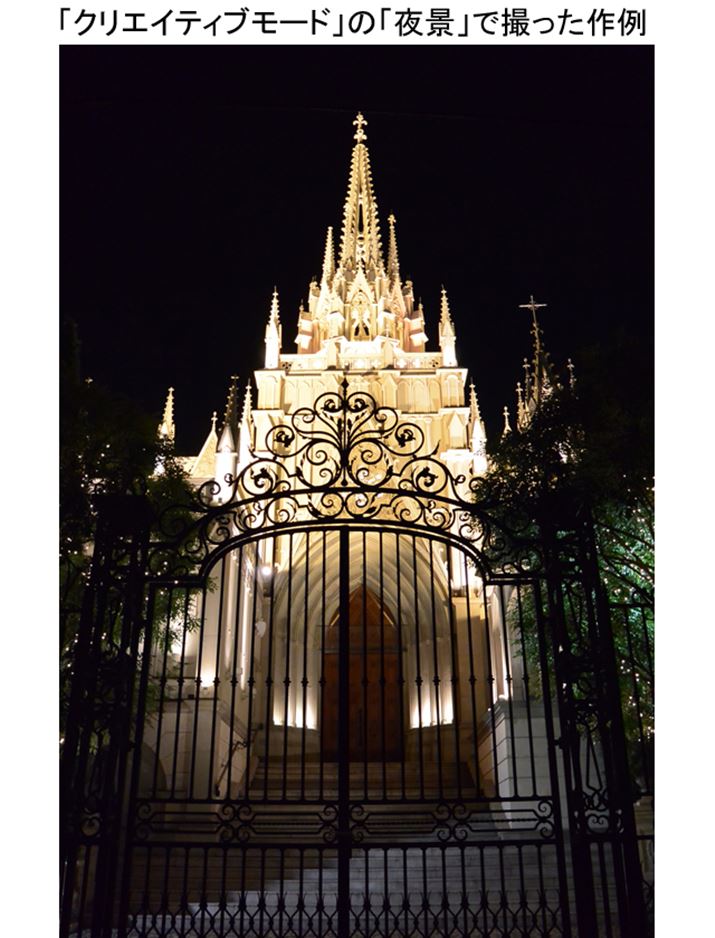 「クリエイティブモード」の「夜景」に設定して、ライトアップされた建物を撮ってみた。「オートモード」でもキレイだが、建物の細かい部分が光でつぶれてしまっているのがわかる