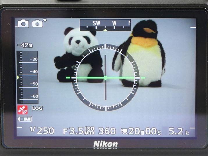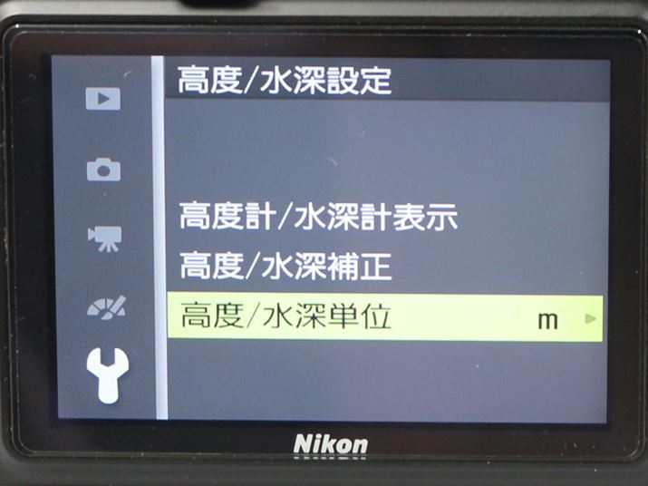 高度と水深は、どちらか片方だけの測定となる。高度/水深設定をONにしておけば、ログデータとしても取得されるので、ダイビングでどれだけ潜ったということがマッピングできて楽しめそう! 写真右は、液晶モニターに計測機能を表示したもの。中央にある丸い形のものは電子コンパスで、その中心に伸びている緑色の横線は水準器だ