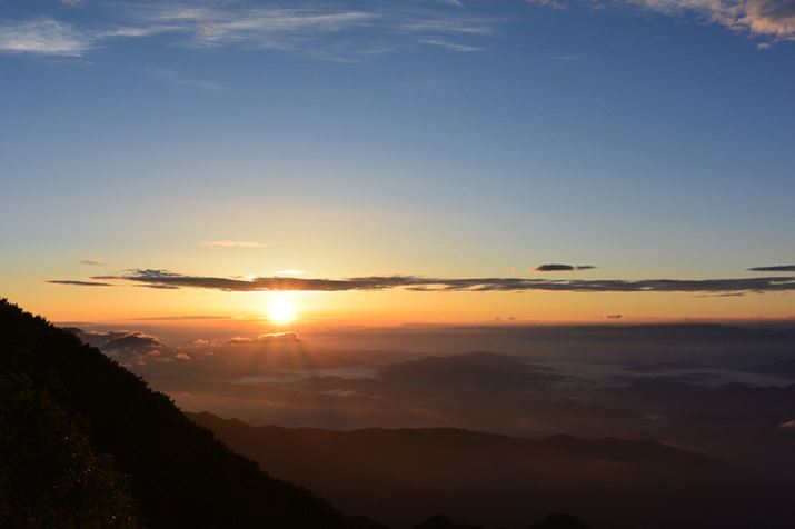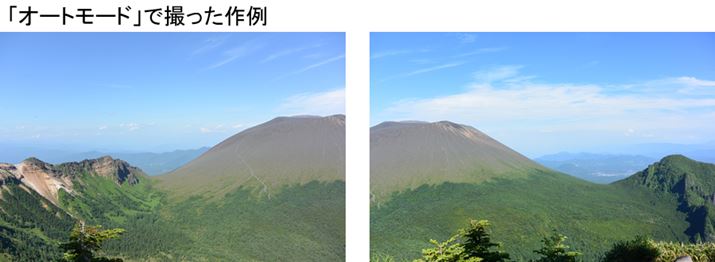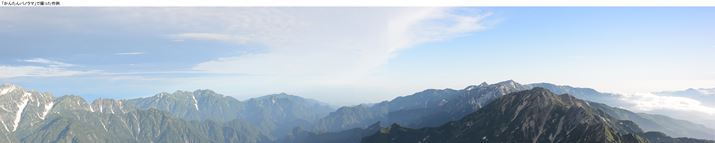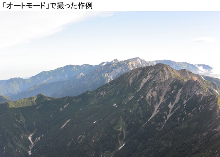 山頂で遠くに見える山の稜線を撮影しても、通常の撮影では一部しか写せず。パノラマ写真(下)にすると、山頂から見渡したような情景を残すことができる。手動でカメラを動かしているため、ホワイトバランスが若干異なる部分があるが、慣れてくると下のような違和感のないパノラマ写真が撮れた