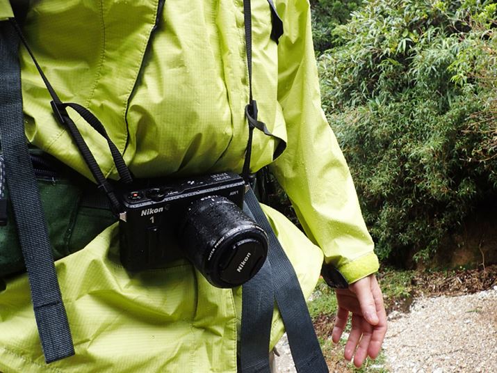 雨の中、レインウェアの上からミラーレス一眼をぶら下げているなんて、「Nikon 1 AW1」じゃなきゃできないこと! まわりの登山者がカメラを急いで片付けている時でも堂々と外に出しておける。雨が降る中で撮影できるって、すばらしい!