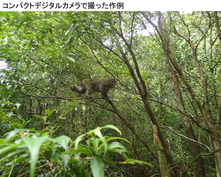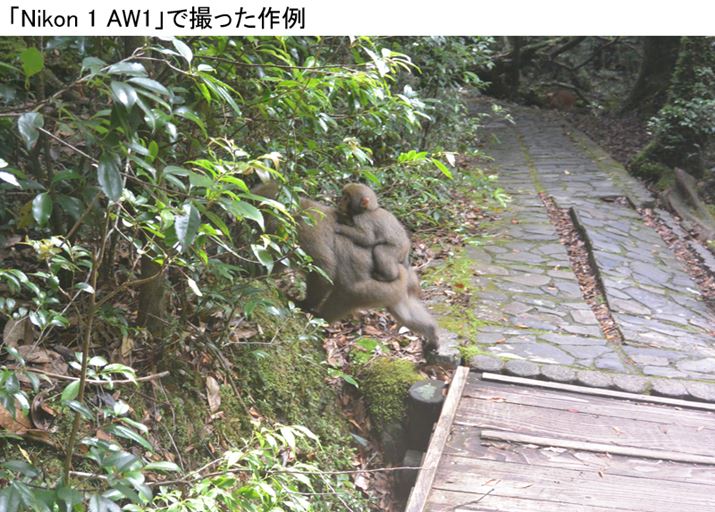 猿を発見したので、撮ってみた。コンパクトデジタルカメラで撮ったものは、猿の動きにカメラの処理が追いつかず顔までぶれている。「Nikon 1 AW1」は動いている感じは残しつつ、顔は目までしっかり認識可能