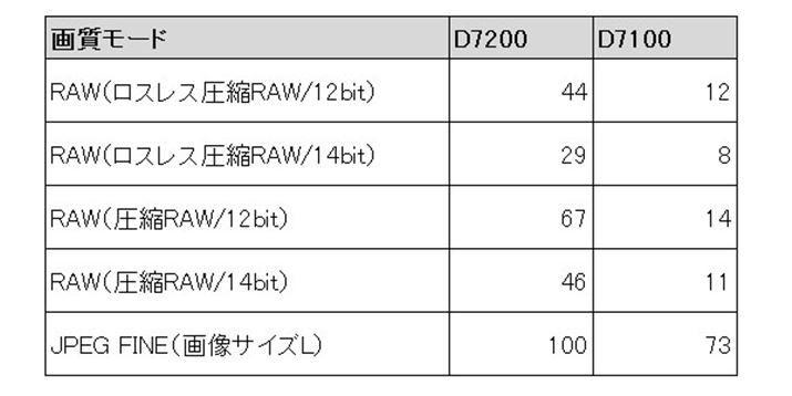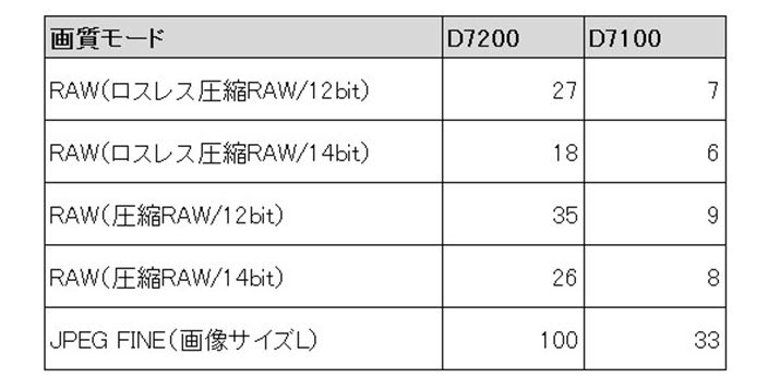 D7200とD7100の連続撮影可能コマ数の比較(DXフォーマット時)