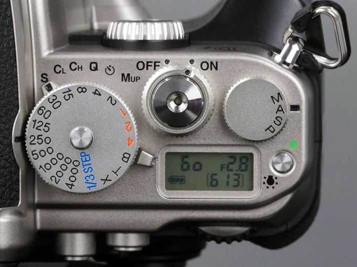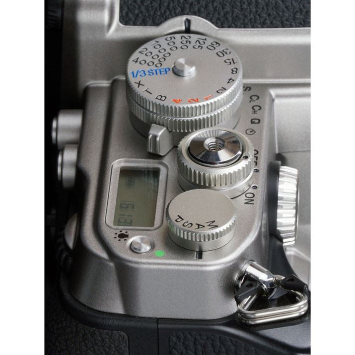 上面右側には、シャッタースピードダイヤルと露出モードダイヤルを備える。シャッターボタンはレリーズソケット付き