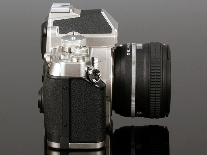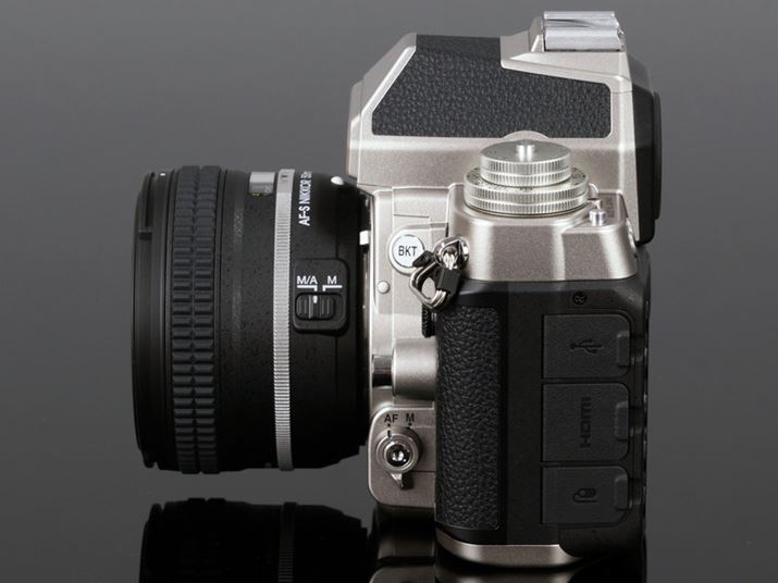「FM/FE」シリーズなど、ニコン製フィルムMF一眼レフを彷彿させる外観デザイン。ニコンの製品を含めて世界中のフィルムカメラを参考にして設計されたという。143.5(幅)×110(高さ)×66.5(奥行)mmで重量765g(バッテリーおよびSDメモリーカードを含む、ボディーキャップを除く)の小型・軽量ボディに仕上がっているのもポイントだ。左側面には、USB端子、HDMIミニ端子、アクセサリーターミナルを備えている