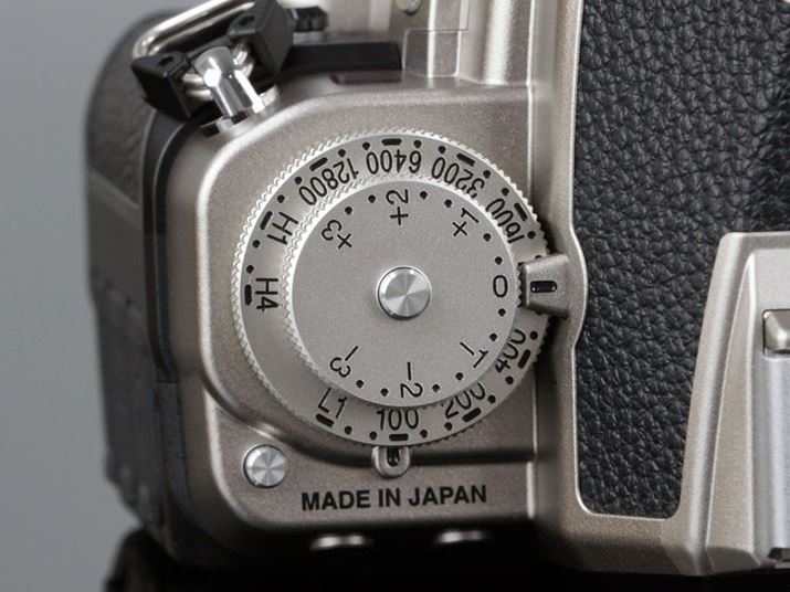 特にカメラ上部のメカニカルダイヤルの徹底度がすごい。上面は、軍艦部を挟んで、左に感度ダイヤルと露出補正ダイヤルが、右にシャッタースピードダイヤルと露出モードダイヤルが並ぶ。これらのメカニカルダイヤルはすべて金属の削り出しで、ダイヤル上面の数字は刻印という凝りよう。ダイヤル外周には細かいローレット加工が施されている。さらに、前面のサブコマンドダイヤルや、「FM/FE」シリーズに似たデザインの軍艦部も特徴的な部分だ。各種ボタンも、ニコンの往年のフィルムMF一眼レフをモチーフにして作られているという。