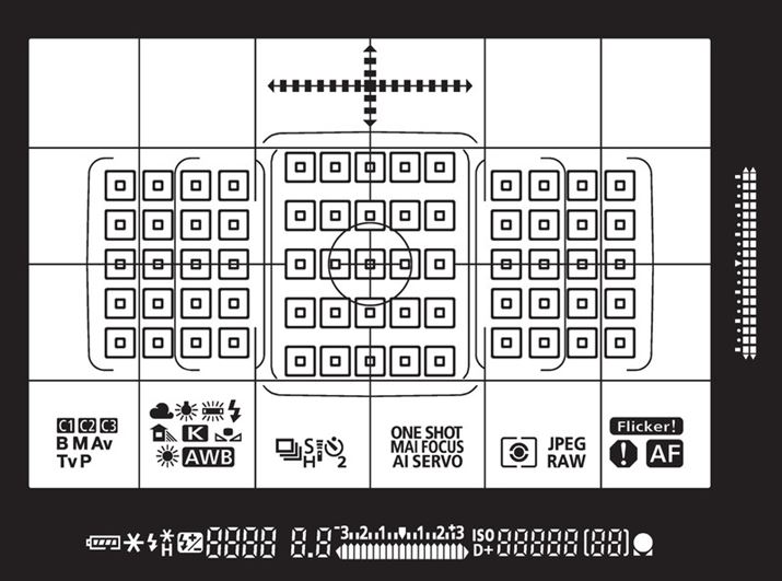 ファインダー内表示をすべてオンにした状態。EOSシリーズとして初めて透過型液晶デバイスを採用し、撮影情報の表示数が大幅にアップした