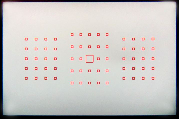 EOS 7D Mark IIのファインダー内を撮影した画像(※ファインダー内をデジカメで撮影したものになります。実際のファインダーの表示をそのまま撮影できているわけではありません)。65点のすべてがオールクロス仕様のオートフォーカスシステムで、ファインダーの広いエリアでオートフォーカスを利用できる