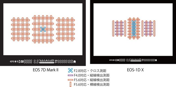 EOS-1D Xのオートフォーカスシステムとの比較。測距可能エリアは、EOS 7D Mark IIが約16.5×6.4mmで、EOS-1D Xが約18.0×8.0mmだが、APS-Cセンサーを採用するEOS 7D Mark IIは、35mmフルサイズセンサーを採用するEOS-1D Xと比べて、ファインダー内のAFエリアのカバー率が広くなる