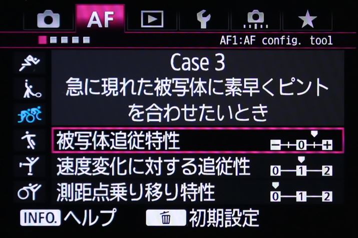 EOS-1D Xと同様、最新の「AIサーボAF III」を採用。EOS-1D Xとは設定項目が少し異なるが、AIサーボAFの特性をカスタマイズできる