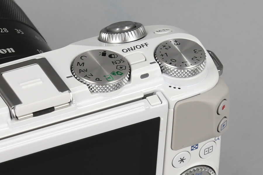 下位モデル「EOS M2」と比べて多くの点が進化したEOS M3。なかでもトピックとなるのが、一眼レフユーザーの利用を意識したデザインと操作性を採用したことだ。ボディ上面に、撮影モードダイヤル、露出補正ダイヤル、電子ダイヤルの計3つのダイヤルを装備するほか、しっかりとしたグリップも採用し、本格的な撮影にも対応できる、よりカメラらしいスタイルのボディに仕上がっている。撮影モードダイヤルは従来も搭載していたが、EOS M3では、P/Tv/Av/Mなどの各種モードをダイレクトに設定できる一般的なものになった。さらに、従来は非対応だった外付け電子ビューファインダー(EVF)の装着も可能に。1.5型CMOSセンサーを採用する高級コンデジ「PowerShot G1 X Mark II」と同じく、約236万画素の外付けEVF「EVF-DC1」をアクセサリシューに装着して利用することができる(※従来モデルのEOS M/EOS M2での利用は不可)。