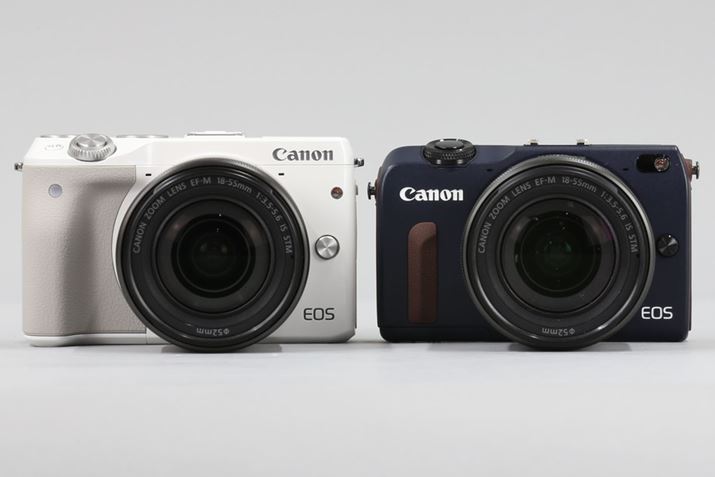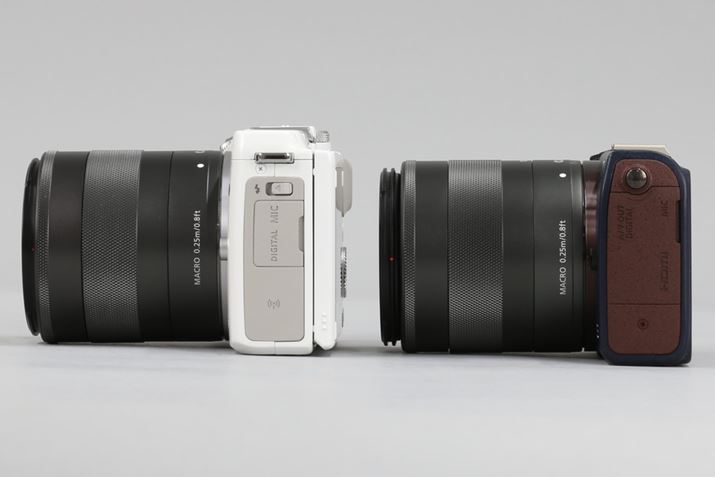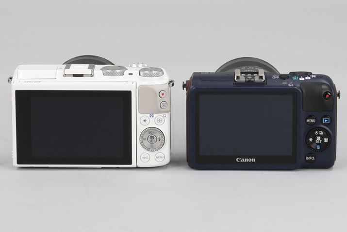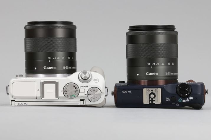 写真左のEOS M3のボディサイズは約110.9(幅)×68.0(高さ)×44.4(奥行)mmで、重量は約366g(バッテリー、メモリーカード含む)。右のEOS M2は約104.9(幅)×65.2(高さ)×31.6(奥行)mmで重量274g(バッテリー、メモリーカード含む)