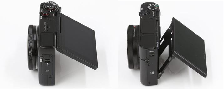 両モデルともチルト可動式モニターを採用。PowerShot G7 Xは上方向に180度回転可能。RX100 IIIは下方向にも動かせる