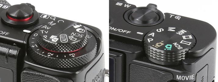 PowerShot G7 X(左)は、撮影モードダイヤルと露出補正ダイヤルの2段ダイヤルを採用。RX100 III(右)は撮影モードダイヤルのみとなる