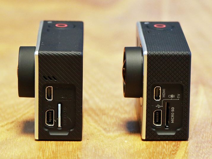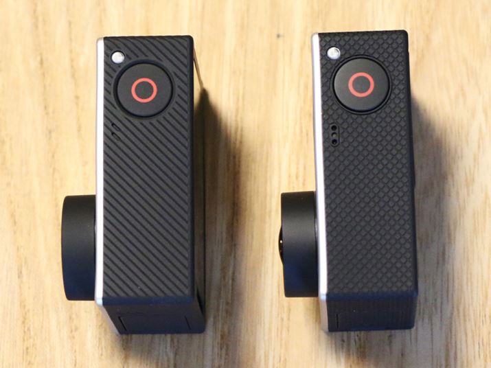 サイズは59(幅)×40.5(高さ)×30(奥行)mmで、ディスプレイを搭載していない「HERO3+ Black Edition」と同じ。重量はディスプレイを備えたためか、「HERO4 Silver」のほうが10g重い83gとなっている(左:HERO4 Silver、右:HERO3+ Black Edition。以下、同)