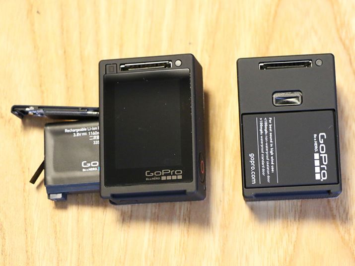 ディスプレイの搭載にあわせ、「HERO3+ Black Edition」では背面にセットされていたバッテリーが「HERO4 Silver」では本体内に装着する仕様になった