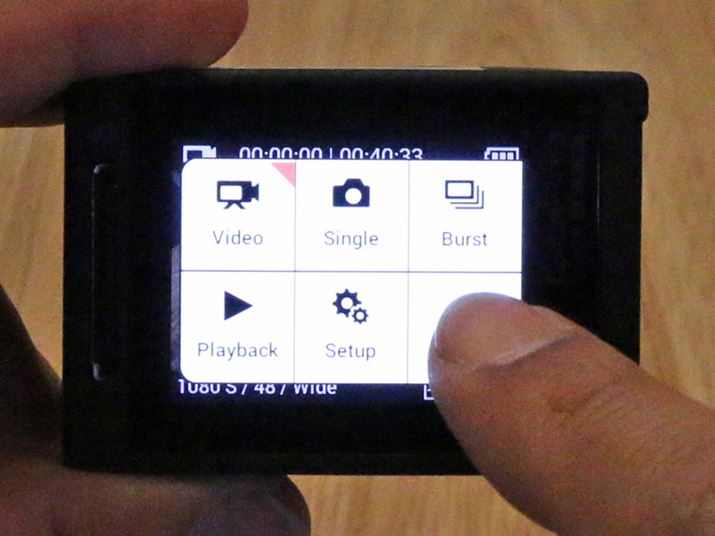 ディスプレイでは撮影モードやメニューの選択、撮影した動画/静止画の再生が行える。もちろん、撮影前にアングルチェックを行うことも可能だ。タップやスワイプなどの操作に対応しているが、静電式パネルなのでグローブを装着した状態では反応しない。