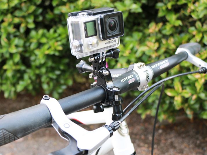 ハウジングに入れた「HERO4 Silver」を自転車に装着してみた。「GoPro」を乗り物や身体に固定するためには、別売のアクセサリーが必要となるので注意しよう。今回、利用したアクセサリーは「ハンドルバー/シートポストマウント GRH30」