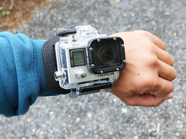 「HERO3 リストハウジング AHDWH-301」で、「HERO4 Silver」を手首に固定。サイズの調整幅が広いため、たとえばウインタースポーツのウェアの上から装着することも可能だ