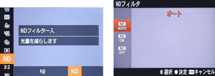 PowerShot G7 Xは、NDフィルターのオン・オフが可能(左)。RX100 IIIには、NDフィルターのオート設定が用意されている