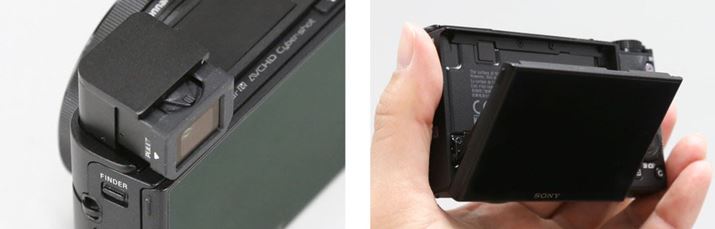 RX100 IIIは、144万ドットの0.39型有機ELファインダー「OLED Tru-Finder」をコンパクトボディに内蔵。モニターは上下方向に動かせる