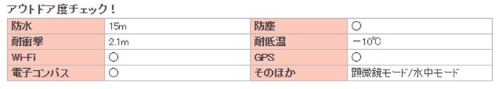 本シリーズの最大の特徴は、タフコンデジの中で唯一のチルト液晶を搭載していること。自分撮りはもちろん、この液晶と広角21mm(35mm判換算)からの光学5倍ズームレンズを使えば、山や海での広大な風景をダイナミックに撮影できるだけでなく、撮影者が後ずさりできないような狭い場所での撮影にも有利なはず。広角レンズで発生しやすい画像周辺の歪みの補正も行ってくれるようになっています。そのほか“アウトドア度”では、前モデル(TG-850 Tough)より、防水シーリングの改善で防水性能が水深15mまで向上。Wi-FiやGPS機能なども、「TG-4 Tough」と同レベルの性能を持っています。