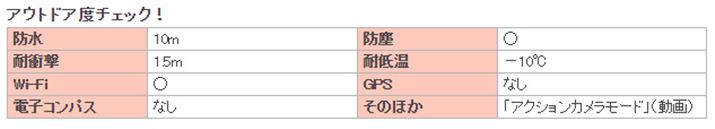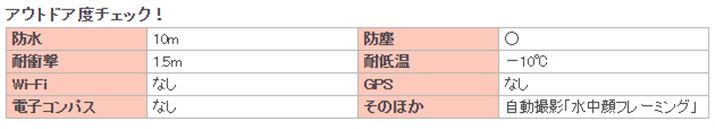 丸みのあるデザインとコンパクトさが特徴的な本シリーズですが、アウトドア度は「15m防水」(前モデル「XP70」より5mアップ)「1.75m耐衝撃構造」「-10℃耐寒」「防塵」と、ほかのモデルに負けていません。2万円前後でこれだけのアウトドア機能とWi-Fi搭載モデルはほかになく、コストパフォーマンスの高いモデルといえるでしょう(2015年7月8日/価格.comにおいて)。光学式手ブレ補正機能も搭載されています。