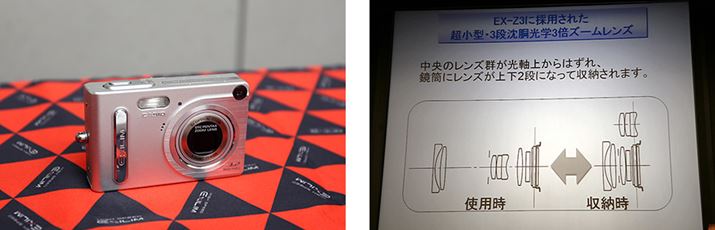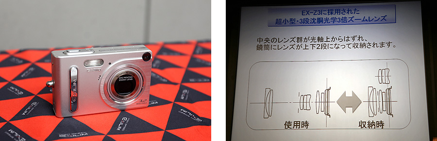 世界的なヒットとなった「EXILIM EX-Z3」(2003年)。ペンタックスとの共同開発により生まれたスライド収納する沈胴式ズームレンズにより、3倍ズームながら“超小型”を実現