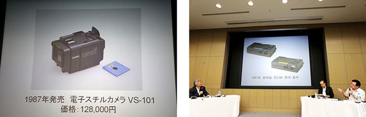 フロッピーディスクに撮った画像をアナログ記録するカメラ「VS-101」(左)。セールスは失敗に終わっても、“フィルムに変わって記録できるまったく新しいカメラ”を作り出したいという気持ちは枯れることはなく、後にデジタル技術を導入したカメラ「DC-90」を開発(写真右)