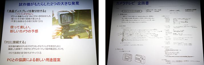 「DC-90」(熱子/重子)に、便宜的に小さな液晶ディスプレイを取り付けて使ったら「楽しい!」と手ごたえを感じたそう。“これはいける”と思ったものの、先の失敗による社内の逆風。そのため、当時開発が進んでいたポケットテレビの延長としてカメラ付きテレビを企画。ここから、ポケットテレビの開発担当だった中山氏が加わることになったのだそう。写真右の企画書を見ると、デジカメというよりも、むしろ現在のスマホに近いコンセプトを掲げていることに驚きます