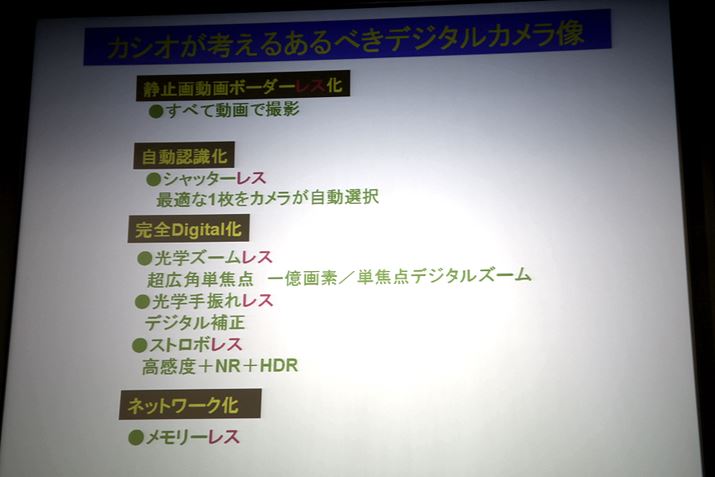 最後に、「カシオが考えるあるべきデジタルカメラ像」が紹介されました。なんと、それは、“メカレス”な完全デジタル化。「究極は、シャッターを押さなくても好きな写真が得られるというのが理想です」と、中山氏。シャッターチャンスに人が狙ってシャッターを押すのではなく、静止画も動画も区別なく記録され、後から欲しい画像を選べるようにしたい。また、そのうえで、画素はあればあるほどいい(笑)。デジタルズームで切り出して得た画像に、目で見えないものが鮮明に見えてくる。それは面白いし、実用的」とし、さらに「レンズなど光学メーカーの専門、得意分野は勝負するところでは無いと考えている」と付け加えていました