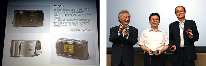 左から、トークイベント進行役の麻倉怜士氏、QV-10開発者の末高弘之氏と中山 仁氏