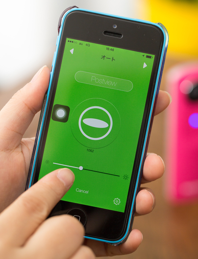 撮影する時はこの緑色の画面に。中央のシータマークがシャッターボタンで、その下の太陽マークで露出補正ができます。右へ動かすと明るく、左へ動かすと暗くなります