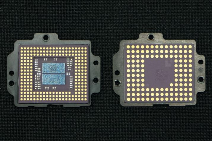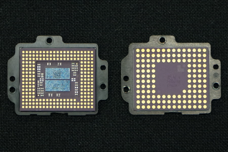 左がRX10 IIに採用されたメモリー一体1.0型積層型CMOSセンサーで、右が従来の裏面照射型CMOSセンサー。センサーの裏側を撮影したものになるが、左のメモリー一体積層型CMOSには、メモリーが搭載されている
