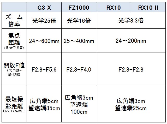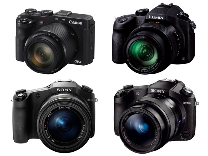 PowerShot G3 X(左上)、LUMIX DMC-FZ1000(右上)、サイバーショット DSC-RX10(左下)、サイバーショット DSC-RX10M2(右下)