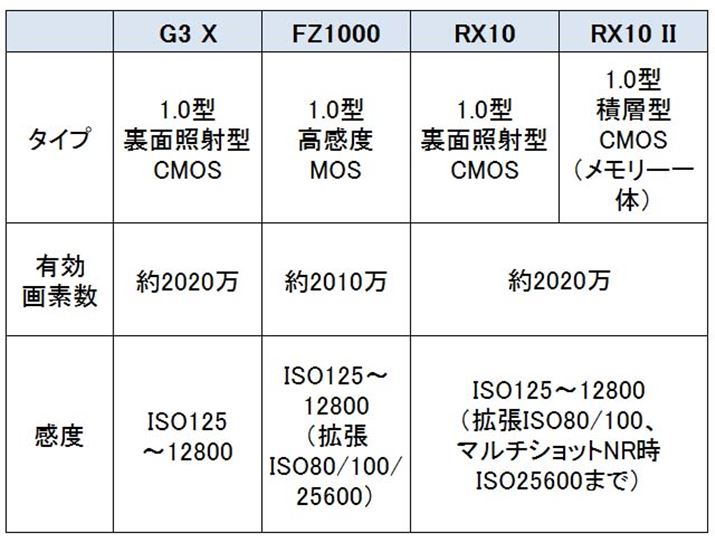 4モデルとも、センサーに、受講面積が1/2.3型の約4倍、1/1.7型の約2.7倍となる1インチ(1.0型)の大型CMOSセンサーを採用している。有効画素数もおよそ2000万画素で、ほぼ横並びだ。対応する感度も、拡張設定に違いはあるものの、常用ではISO125〜12800で変わりがない。