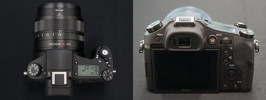 RX10とRX10 IIのボディデザインは同一(写真はRX10 II)。レンズ部に、マニュアルの操作リング(マニュアルリング)に加えて、絞りリングを搭載するのが、他の2モデルとは異なるところだ。さらに、上面には、露出補正ダイヤルのほか、各種撮影情報を表示する液晶パネルも備わっている