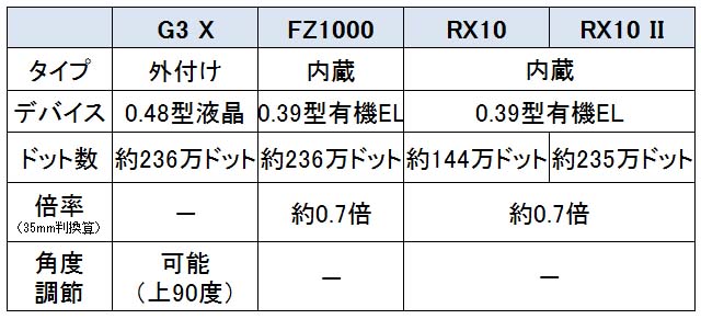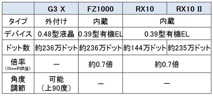 2015年7月7日時点の価格.com最安価格を見ると、G3 Xが9万円台、FZ1000が6万円台、RX10が10万円台、RX10 IIが15万円台となっており、機種によって価格差がある状況だ。なお、G3 Xには、5000台限定で外付け電子ビューファインダーが同梱するEVFキットが用意されている。価格は、ボディ単品にプラス5,000円程度。EVF-DC1単品の価格が18,000円程度(2015年7月7日時点での価格.com最安価格)であることを考慮すると、お買い得なキットとなっている。