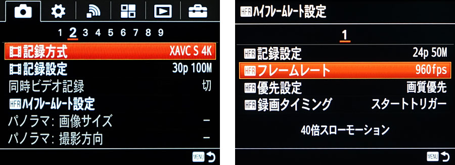 RX10 IIは、XAVC S形式での4K記録に対応(左)。最大960fpsのスーパースローモーション撮影も可能だ(右)