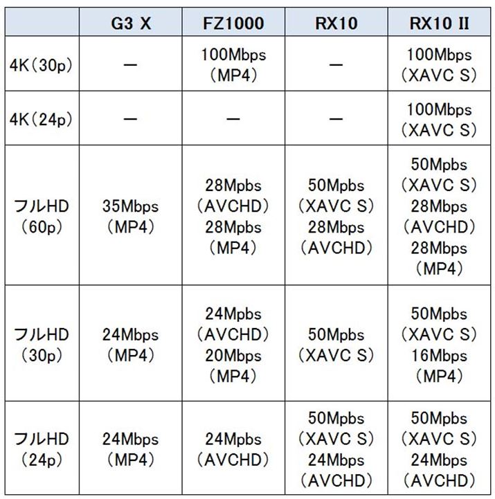 基本機能の違いでは、動画撮影に注目したい。FZ1000とRX10 IIは、4K動画の記録に対応している。より多機能なのはRX10 IIで、画素加算のない全画素読み出しでの4K記録に対応。24pでの4K記録なども可能で、2015年7月7日時点では、レンズ一体型のデジタルカメラとして最高レベルの動画撮影機能を搭載する1台となっている。