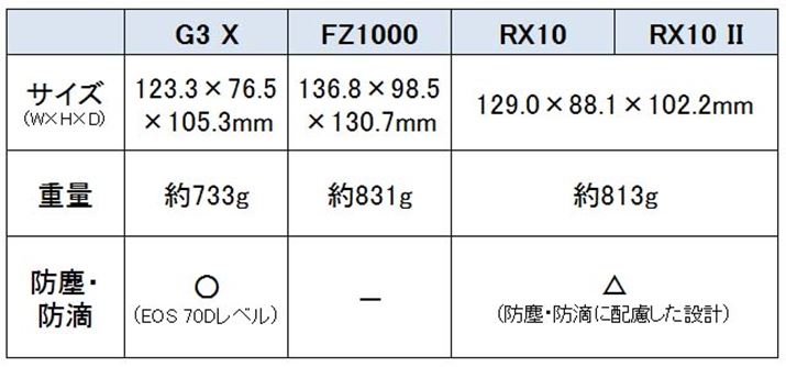 なお、上の表では、防塵・防滴の対応で、G3 Xを「○」、RX10とRX10 IIを「△」とした。G3 Xを「○」にした理由は、公式の製品ページにおいて、「短時間の小雨程度の環境下で使用可能であることを確認」と表記されているほか、防塵・防滴構造についてくわしい説明があったため。RX10とRX10 IIについては、メーカー取材を通じて、「防塵・防滴に配慮した設計」であることは確認できたが、公式ページなどには明記されていないため「△」とした。