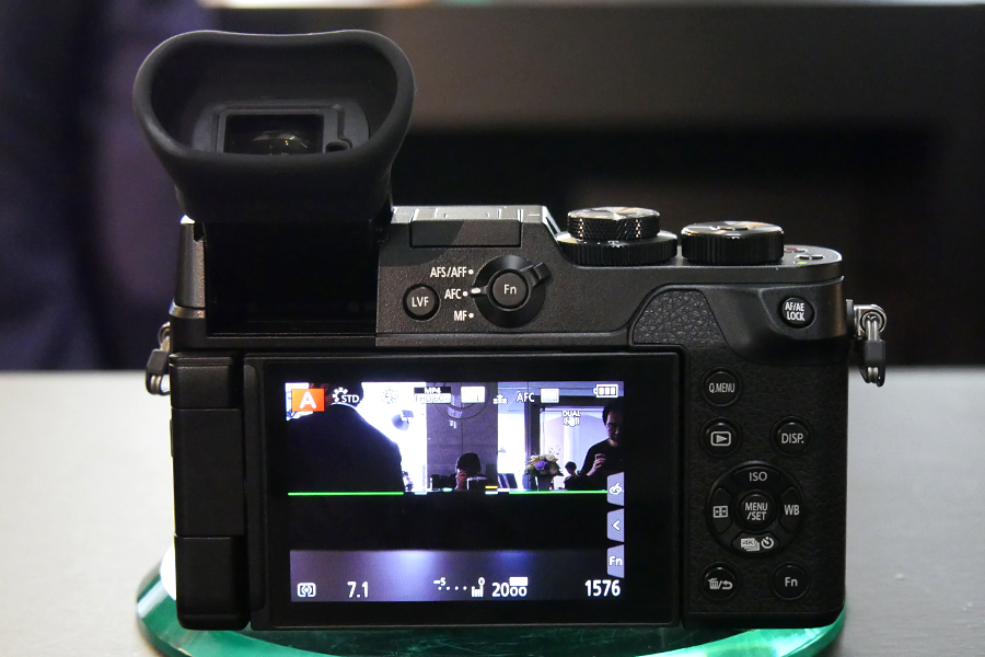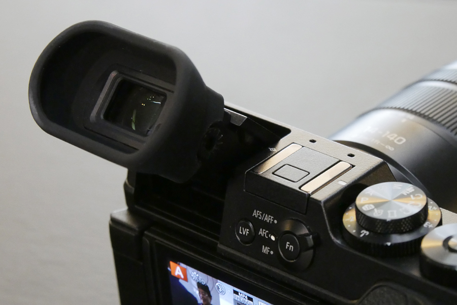 電子ビューファインダー(EVF)には、0.5型の約236万ドット有機EL(OLED)を搭載。ファインダー倍率は35mm判換算で約0.77倍。アイポイントが21mmでメガネをかけながらでも高い視認性を実現している。アイセンサーも備える。GX7のファインダーと同じく、90度可動するチルト機構も備えており、ローアングルでも無理のない姿勢で撮影に集中できるという。タッチパネル搭載のOLEDモニターは3.0型、約104万ドット。GX7ではチルト可動式だったが横に開くタイプに変更されており、左右に約180度、上下に約250度回転する。