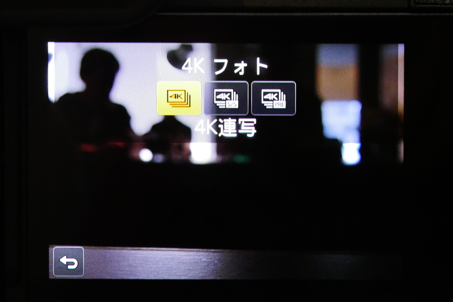 4K連写は、シャッターボタンを押している間連写するというもの。撮影中にはシャッター音が連続で鳴り、連写しているように操作できる。4K連写(S/S)は、ビデオカメラのように、シャッターボタンを1回押すと連写撮影がはじまり、もう1度押すと連写撮影が終了する。4Kプリ連写は、シャッターボタンを押した瞬間の前後約1秒を連写撮影(60コマ)できるというものだ。