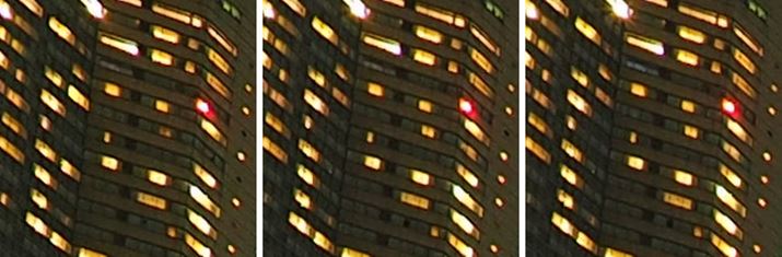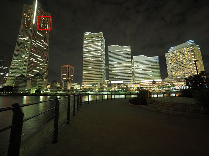広角端7mm(35mm判換算14mm)で、同じ被写体(夜景)をF2.8、F4、F5.6の絞り値で撮り比べてみて、周辺部の点光源の描写をチェックしてみた。結果は、絞り開放から色収差やコマ収差が少なく、点が点として表現された。等倍切り出し画像を見ると、絞り開放から周辺でもシャープな描写が得られていることがわかるはずだ。