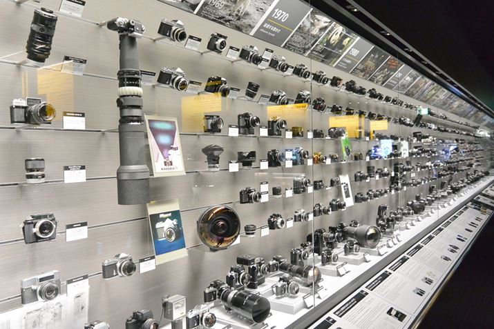 ニコンミュージアムの目玉となるのが、同社のカメラ製品がずらりと並べられた大型のショーケースだ。1948年発売の同社初の小型カメラ「ニコンカメラ」から始まり、最新のデジタルカメラまで約450点もの製品が並べられている。